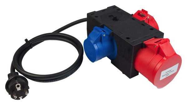 3-fach Messadapter für drei- und einphasige Verbraucher, zur Messung von RPE, RISO und IEA, 16 A/ 32 A CEE-Kupplung 5-polig (passiv) und 16 A CEE-Kupplung 3-polig an Schutzkontaktstecker