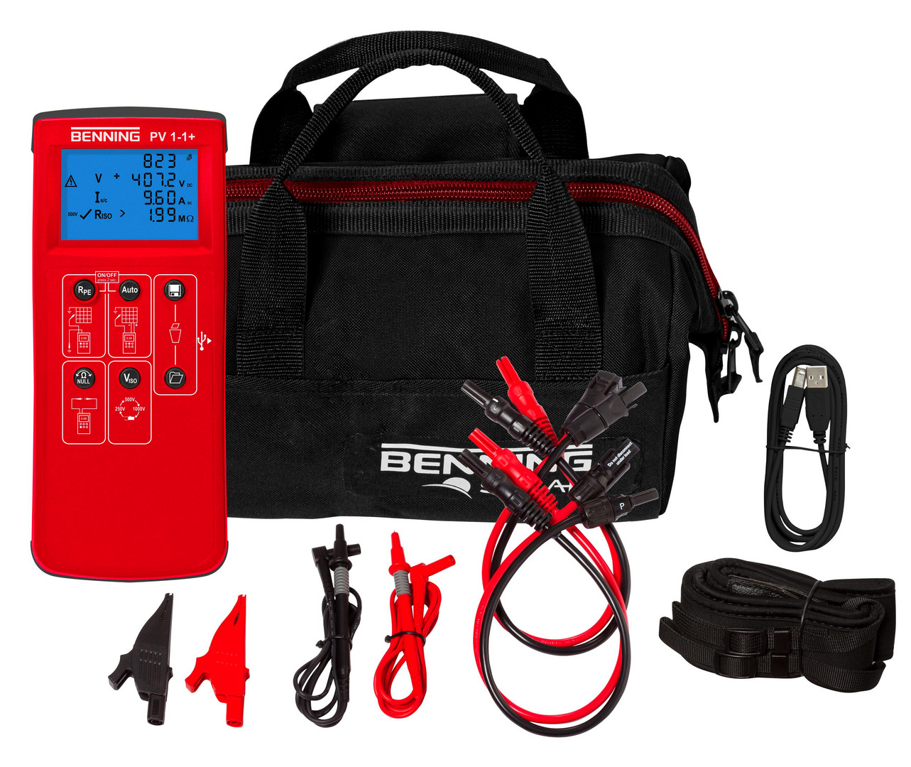 "Benning PV 1-1+. Photovoltaik-Installationstester. Geeignet für Solarteure zur Erstinbetriebnahme, Wiederholungsprüfung, Fehlersuche, Photovoltaik-Sachverständige sowie Service-, Reinigungs- und Wartungsteams. PV-Installationstester für die normgerechte Installations- und Wiederholungsprüfung netzgekoppelter Photovoltaik-Systeme gemäß VDE 0126-23,DIN EN 62446. Moderne PV-Module verwenden PV-Zelltechnologien mit höheren Wirkungsgraden und einer höheren effektiven Kapazität. Aufgrund der zusätzlichen Kapazität, können diese PV-Module im Kurzschlussfall Einschaltströme erzeugen, die weit über den spezifizierten Kurzschlussströmen (Isc) liegen. Vorteile des BENNING PV 1-1+: Verbesserte Prüfkompatibilität von PV-Modulen der neuesten Technologie mit hohen Wirkungsgraden, optimierter Überlastschutz bietet einen 300 % höheren Schutz gegen transiente Kurzschlussströme, modifiziertes Gehäuse mit umlaufenden Gummischutz und Befestigungsösen zur Aufnahme eines Tragsgurtes für handfreies Arbeiten. Ein Plus an Prüfkompatibilität, Ausfallsicherheit und Bedienkomfort. Anzeige graphisch. Hintergrundbeleuchtung der LC-Anzeige ja. Messungen: Isolationswiderstandsmessbereich 0.05 MOhm - 199 MOhm. Nennprüfspannung 250 V. Nennprüfspannung 500 V. Nennprüfspannung 1000 V. Nennprüfspannung einstellbar ja. Isolationswiderstand mit gut/ schlecht-Anzeige. Schutzleiterwiderstandsmessbereich 0.05 Ohm - 199 Ohm. Durchgängigkeitsprüfung der Schutz- und Potentialausgleichsleiter mit 200 mA Prüfstrom. Spannungsmessung ja, 30 V - 400 V AC/DC. Automatische Anzeige der Spannungspolarität mit akustischer/ visueller Warnung bei Falschpolung. Leerlaufspannung bis 1000 V DC. Sichere und für den Anwender gefahrlose Kurzschlussstrommessung bis 15 A DC. Funktionstest durch Strommessung bis 40 A AC/ DC, optional BENNING CC 3 (044038). Anzeige und Speicherung der solaren Einstrahlung W/m2 und der PV-Modul-/Umgebungstemperatur, optional BENNING SUN 2 (050420). Strang-Strang-Vergleich mit Anzeige bei Abweichung > 5 %. Einfache Bedienung für die schnelle und zuverlässige Prüfung mit automatischem Prüfablauf (Leerlaufspannung, Kurzschlussstrom, Isolationswiderstand). Sichere Messverbindung bei Energielieferung der PV-Anlage. Integrierte Echtzeituhr zur Speicherung der Messwerte mit Datum- und Zeitstempel. Funkverbindung Wireless Sun link zum optionalen Einstrahlungs-/ Temperaturmessgerät BENNING SUN 2 (050420). Messwertspeicher ja, für 200 Photovoltaikstränge. Ausführung der Schnittstelle USB-A, für Messwertdownload und Downloadsoftware zur Prüfprotokollerstellung in MS Excel. Automatische Abschaltzeit APO einstellbar bis 10 Min. Stromversorgung Batterie, 6 x 1.5 V Mignon AA LR6. Inklusive Messleitungen, Krokodilklemmen, MC4-/ Sunclix-Messleitungen, Tasche, 6 x 1.5 V Mignon AA LR6 Batterien, Downloadsoftware, Sicherung 0,5 A (749771)"