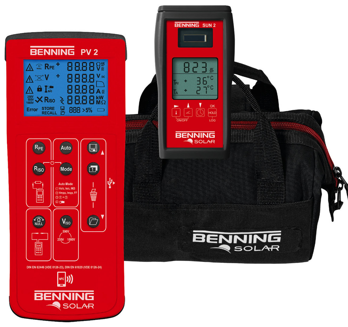 Benning PV 2 SET bestehend aus Benning PV 2 PV-Installationstester und Kennlinienmessgerät, Benning SOLAR Manager PC-Software, Benning SUN 2 Einstrahlungs- und Temperaturmessgerät und Umhängetasche. Mit dem Benning PV 2 SET haben Sie sofort alle benötigten Messgeräte, PC-Software und eine praktische Umhängetasche zur Hand, um die normgerechte Installations- oder Wiederholungsprüfung und Kennlinienmessung netzgekoppelter PV-Systeme gemäß DIN EN 62446 (VDE 0126-23) und DIN EN 61829 (VDE 0126-24) durchführen zu können sowie auch deren Dokumentation. Benning PV 2 PV-Installationstester und Kennlinienmessgerät für die einfache, schnelle und sichere Prüfung, zur Messung der Strom-Spannungs-Kennlinie (I-U) und Leistungskennlinie (P-U), Anzeige von Umpp, Impp und Füllfaktor (FF), automatische Prüfabläufe für Kennlinienmessung und Uoc, Isc, Riso, separate Riso-Messung über 4 mm Messleitungen für PV-Kabel etc., Isolationsmessung mit 250 V, 500 V und 1000 V Prüfspannung, Messwertspeicher mit Echtzeituhr (Datum-/Zeitstempel). Grafikdisplay. USB-Schnittstelle. Funkschnittstelle - Wireless SUN Link zwischen Benning PV 2 und Benning SUN 2. Benning SUN 2 Einstrahlungs- und Temperaturmessgerät zur Messung der Bestrahlungsstärke in W/m2, PV-Modul- und Umgebungstemperatur, mit digitalem Kompass, Neigungswinkelmesser, Datenlogger mit Echtzeituhr, USB-Schnittstelle. PC-Software Benning SOLAR Manager für die Dokumentation und Leistungsbeurteilung der I-U- und P-U-Kennlinien, STC-Berechnung und Kennlinienvergleich über integrierte PV-Moduldatenbank. In die praktische Umhängetasche kann das Benning PV 2 eingesetzt werden. Dies ermöglicht ein handfreies Arbeiten an schwer zugänglichen und gefährlichen Messstellen.