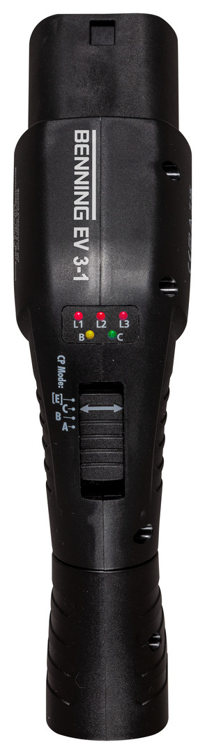 Benning EV 3-1. Der Wallboxtester und Messadapter Benning EV 3-1 ermöglicht die einfache und schnelle Funktionsprüfung, sowie die Fehlersuche an Wallboxen. In Verbindung mit einem geeigneten Installationsprüfgerät, kann die Sicherheits- und Funktionsprüfung von AC-Ladestationen (Wallboxen) für Elektrofahrzeuge gemäß DIN VDE 0100-600 (IEC 60364-6) und DIN VDE 0105-100 (EN 50110) normkonform nachgewiesen werden. Kompatibel für 1- und 3-phasige Ladestationen (EVSE) der Ladebetriebsart 3 mit Typ-2-Steckverbinder. Ermöglicht die einfache Funktionsprüfung der Wallbox sowie die Kontaktierung des Installationsprüfgerätes mit der Ladestation. Simulation unterschiedlicher Fahrzeugzustände: A (nicht verbunden), B (verbunden, nicht bereit), C (laden ohne Belüftung), E (Fehler, Kurzschluss zwischen CP-PE). Anzeige der Ausgangsspannung (L1/L2/L3) und Fahrzeugzustände (B/C) über farbige LEDs. Überprüfung des EVSE-Verriegelungssystems ab Status B (Freigabe des Ladekabels wird blockiert). 4 mm Buchsen (L1/L2/L3/N/PE) für die einfache Verbindung mit Installationsprüfgerät. 4 mm Buchse (CP-Signal) für die Analyse des CP-Signals über ein Oszilloskop/Multimeter. Verwendbar an allen gängigen Ladestationen (Wallboxen) mit Ladesteckdose und festangeschlossenem Ladekabel Typ 2. Aufgrund der einfachen Handhabung auch von elektrotechnisch unterwiesenen Personen (EuPs) zu bedienen. Messkategorie CAT II 300 V.