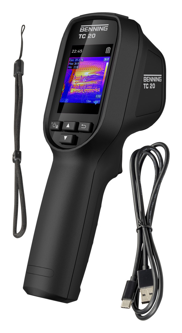 Benning TC 20. Wärmebildkamera im Pistolenformat. Leistungsstarke Thermographie erstaunlich erschwinglich. Aufzeichnung von Wärmebildern, optischen und fusionierten Bildern, präzise Messung und Darstellung von Temperaturdifferenzen. Temperaturmessbereich -20 °C - 550 °C. Fusionierte Aufnahmen aus Wärmebild und optischen Bild für mehr Details und Konturenschärfe. Thermische Auflösung: 96 x 96 (9.216 Messpunkte), hochskalierbar auf 240 x 240 (57.600 Messpunkte) über Enhanced IR-Bildoptimierungstechnologie. Thermische Empfindlichkeit: < 0,05 °C (50 mK). Relative Messgenauigkeit 2 % v. M. oder 2 °C. Hohe Bildrate von 25 Hz für die flüssige und ruckelfreie Darstellung von Wärmebildern. 3 Bildmodi (Thermisch, Fusion, Optisch) und 7 Farbpaletten (Eisen, Regenbogen, Übertemperatur, Rot, Fusion, Weiß-/Schwarzglühend) zur Wärmebilddarstellung. Integrierte optische Kamera mit 640 x 480 Bildpunkte, Weitwinkelobjektiv (50° x 50°). Automatische Erkennung von Hotspots (MAX) und Coldspots (MIN), Centerspot (Bildmittentemperatur). 2 Erfassungsarten: Einzelbild, Geplante Aufnahme mit Zeitintervall (hh:mm:ss) sowie Bildanzahl. Alarmfunktion bei hoher Temperatur. Laserstrahl zur schnellen Anvisierung des Zielobjekts. Kompaktes Pistolenform und intuitive Bedienung. Integrierter 4 GB Flashspeicher, 2,4? (6,1 cm) Farb-LCD-Screen, Gehäuse mit ¼ Zoll Stativ-Gewinde, wiederaufladbare Li-Ionen-Batterie. Max. Batterielaufzeit 8 h. Datenübertragung zum PC über USB Typ C. PC-Software BENNING TC Analyser zur Analyse und Dokumentation der aufgenommenen Wärmebilddaten, diverse Messwerkzeuge zur Temperaturmessung (Punkt, Linie, Fläche, Delta, etc.), 5 Bildmodi, 16 Farbpaletten und Temperaturverteilungsdiagramme, erleichtern das Auffinden von Problemstellen, Datenübertragung über USB Kabel Typ C - Typ A, kostenloser Download und Updates. Schutzart IP 54. Falltest 2 m. Gewicht 0.29 kg. Inklusive Handschlaufe, USB-Typ C Verbindungskabel, PC-Software BENNING TC Analyser, Li-Ionen Akku.