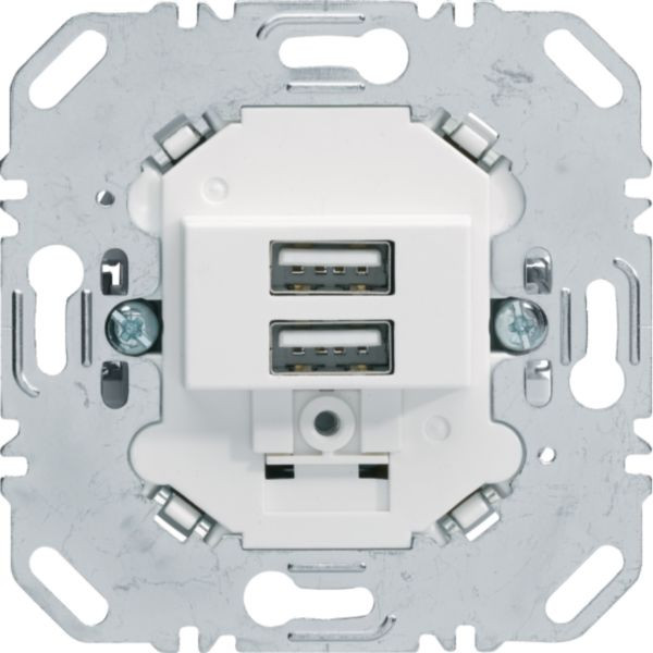 USB Ladesteckdose, Unterputz, 230 Volt, bietet zwei USB-Buchsen Typ A mit einer Stromstärke von 3.0 Ampere. Ideal für das Laden von Tablets, Smartphones und weiteren mobilen Geräten. Ausgestattet mit kurzschlusssicherer und überlastsicherer Elektronik. Tragring eckig, in polarweiß matt, keine Datenübertragung, Anschluss über Schraubklemmen.