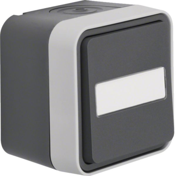 Wechselschalter Aufputz W.1 von Berker, grau, mit Beschriftungsfeld und blauer LED-Beleuchtung, 230 Volt. IP Standard 55 für erhöhten Schutz in Feuchträumen. Ausstattung: Beschriftungsfeld 50 x 16 mm, N-Klemme, Steckklemmen, vollflächige Dichtung, Montagelöcher, Wago 2-Leiter Verbindungsklemme. Material: schlagfester Thermoplast. Ideal für Wechselschaltungen, 10 Ampere/250 Volt.