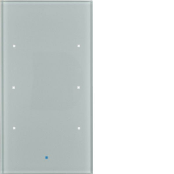 Putzausgleich 20 mm, mit einer blauen Betriebs-LED und weißen Status-LEDs, Bedienung durch leichte Berührung der Sensorflächen an den weißen LEDs, mit Demontagewerkzeug, für Schalt-, Tast-, Dimm- und Jalousiefunktionen; Wertgeber für Dimm-, Positions-, Helligkeits- und Temperaturwerte 1 und 2 Byte, als Reglernebenstelle verwendbar, Ein- und Zweiflächenbedienung parametrierbar, Abrufen, Einstellen und Speichern von 8 Lichtszenen, Einflächenbedienung für Schalten, Tasten, Dimmen und Jalousie Glas-Sensor 3fach Komfort TS Sensor, alu