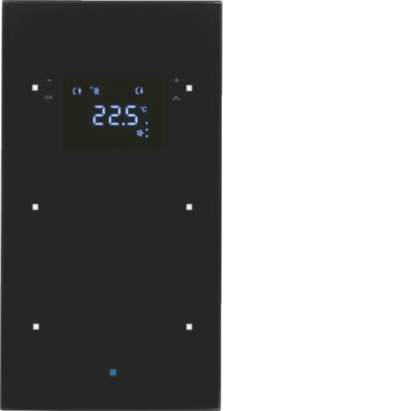 Betriebsspannung 18 - 30 V=; Bedienung durch leichte Berührung der Sensorflächen; mit integriertem Busankoppler; mit einer blauen Betriebs-LED und weißen Status-LED; LED-Display mit Symboldarstellung; mit 2 zusätzlichen Display-Sensorflächen; Ein- und Zweiflächenbedienung parametrierbar; für individuelle Einzelraumregelung; wandbündige Montage möglich mit Einbaudose 2fach für Glas-Sensor Berker Best.-Nr. 1870.