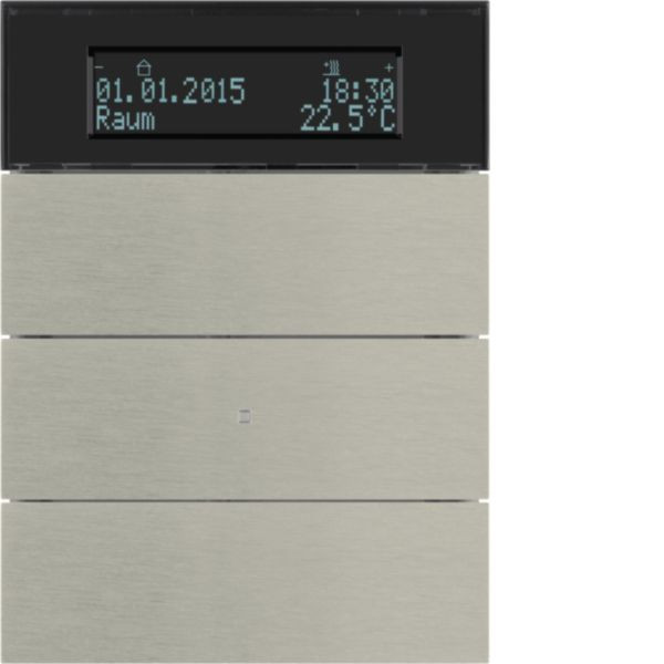 für Busankoppler UP plus, zur Installation in einfachen Einbaudosen, rahmenloses Design, mit Demontageschutz, mit blauer Betriebs-LED und weißen Status-LED (Beschriftungsfeld-Beleuchtung), LC-Display mit Symboldarstellung, Textanzeige und Beleuchtung, mit 2 zusätzlichen Display-Funktionstasten, Ein- und Zweiflächenbedienung parametrierbar, mit Raumtemperaturschaltuhr- und 2 Wochenschaltuhrfunktionen, individuelle Einzelraumregelung, für individuelle Einzelraumregelung, für stetige (PI-) oder schaltende (2-Punkt-) Regelung von max. 2 Regelkreisen Tastsensor 3fach mit Temperaturregler und Display B.IQ Edelstahl Rostfrei