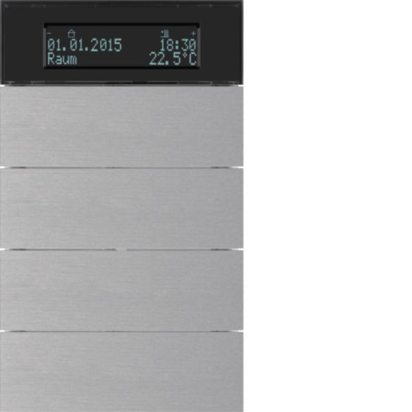 für Busankoppler UP, mit Temperaturregler; zur Installation in einfachen Einbaudosen; rahmenloses Design; mit Demontageschutz; mit blauer Betriebs-LED und weißen Status-LEDs (Beschriftungsfeld-Beleuchtung); LC-Display mit Symboldarstellung, Textanzeige und Beleuchtung; mit 2 zusätzlichen Display-Funktionstasten; Ein- und Zweiflächenbedienung parametrierbar; mit Raumtemperaturschaltuhr- und 2 Wochenschaltuhrfunktionen; für individuelle Einzelraumregelung, für stetige (PI-) oder schaltende (2-Punkt-) Regelung von max. 2 Regelkreisen. Tastsensor 4fach mit Temperaturregler und Display B.IQ Alu
