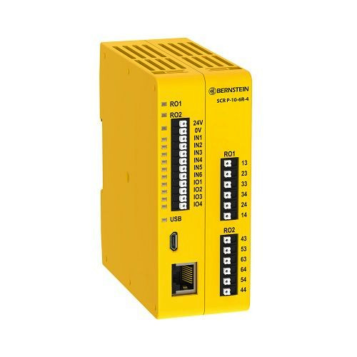 Programmierbares Sicherheitsrelais SCR P-10-6R-4 zur Überwachung aller gängigen Sicherheitsfunktionen. Es verfügt über bis zu 10 Sicherheitseingänge, 4 davon konfigurierbar als Ausgänge. 2x3 unabhängige Freigabepfade mit je 6A Schaltleistung ermöglichen 2 unabhängige Abschaltpfade. Die Konfiguration des Relais kann dabei ganz einfach über die kostenlose, intuitiv bedienbare Kofnigurationssoftware vorgenommen werden. Dank des integrierten Ethernet-Anschlusses, können alle notwendigen Parameter an die Maschinensteuerung weitergegeben werden.
