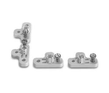 Außenbefestigungslaschen aus Polycarbonat zum Montieren von Gehäusen ohne Öffnung der Deckel. Unterschiedliche Anordnungsmöglichkeit der Laschen im 90°-Versatz. Farbe RAL 7035.