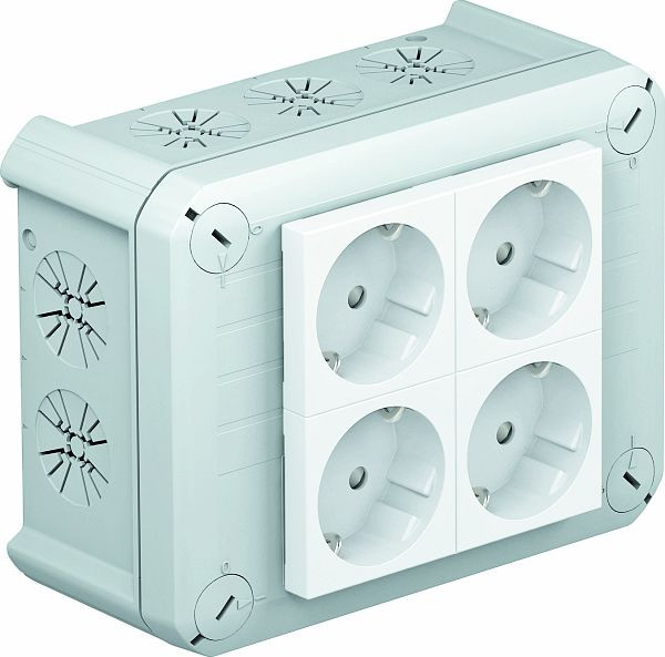 | Kurzbeschreibung | Kabelabzweigkasten 4 Schuko Steckdosen 33° ws 2+2 150x116x67 Polypropylen lichtgrau RAL 7035 |