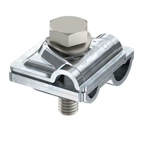 Schnellverbinder zum Erstellen von T-, Kreuz- und Parallel-Verbindungen. Montage mit Schraube M10 x 40 aus rostfreiem Edelstahl. Passend für Bewehrungsstähle ø 6-16 mm und Rundleiter ø 8-10 mm. Entspricht den Anforderungen nach VDE 0185-305 (IEC 62305).