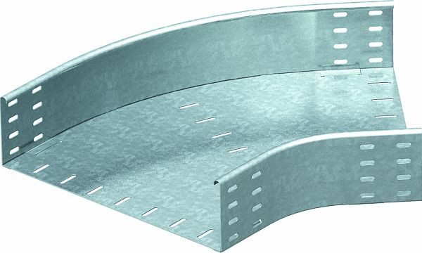 Bogen 45° horizontal für alle Kabelrinnentypen mit der Seitenhöhe 85 mm. Mit oben eingerolltem Seitenholm zur Verstärkung und als Kantenschutz.