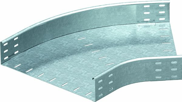 Bogen 45° horizontal für alle Kabelrinnentypen mit der Seitenhöhe 85 mm. Mit oben eingerolltem Seitenholm zur Verstärkung und als Kantenschutz.