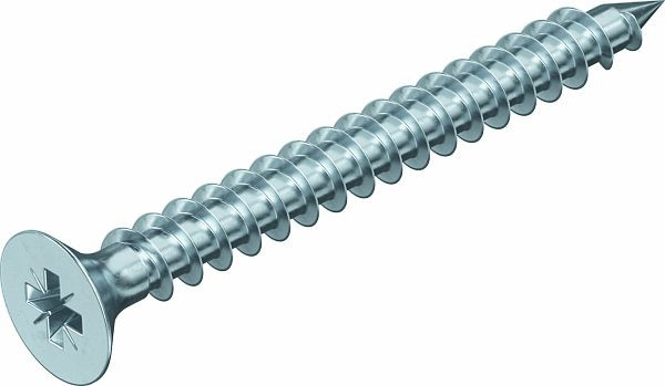 Stahl gehärtet, galvanisch verzinkt und hostaflonbeschichtet. Senkkopf mit Kreuzschlitz (Pozidrive Gr. 2 außer Ø 6 mm Pozidrive Gr. 3).
