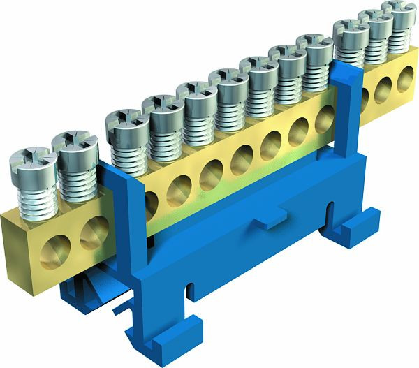 12 Klemmstellen bis 16 mm², Klemmschiene Messing vernickelt, Schrauben Stahl, galvanisch verzinkt und transparent passiviert, zum Aufschnappen auf Hutschienen 35 mm nach DIN EN 50022 (quer) oder Flachschienen 10 x 2-2,5 mm (längs)