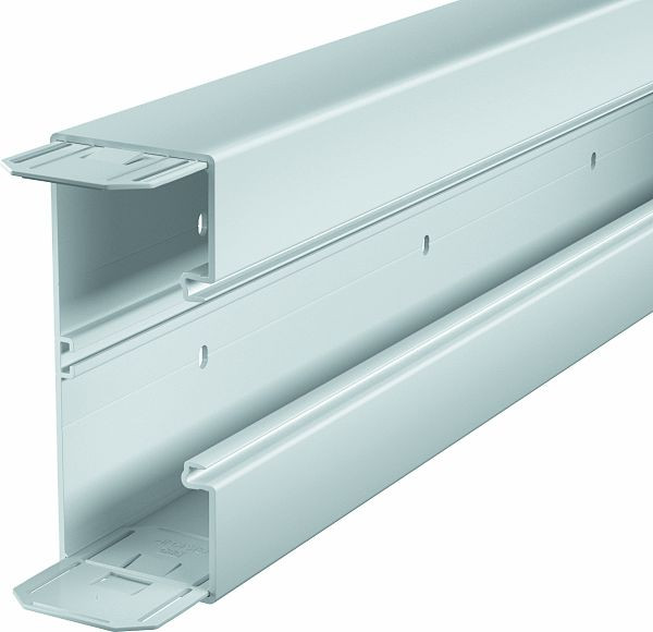 GK Geräteeinbaukanal aus bleifreiem Polyvinylchlorid, geeignet zur Montage direkt auf der Wand oder an Wandkonsolen. Die Befestigung erfolgt über die Regellochung im Kanal. Der GK Geräteeinbaukanal verfügt über ein C-Profil am Boden zur Aufnahme einer Trennwand aus Kunststoff. In den Geräteeinbaudosen der Serie 71GD... können alle Schalterprogramme in Tragring- und Tragbügelbauweise sowie Modul 45-Installationsgeräte installiert werden. Die Systemöffnung beträgt 76,5 mm. Je Kanallänge ist einseitig ein Kupplungspaar vormontiert. Das Oberteil muss separat bestellt werden.