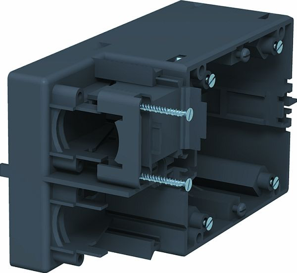 Installationskanaldose zum Einbau einer CEE-Steckdose mit 4-Punkt-Befestigungsspur 60 x 60 mm oder 70 x 70 mm; mit außenliegender Zugentlastung für Mantelleitungen bis Ø 18 mm; mit Exzenterriegel zur schraubenlosen Schnellbefestigung.