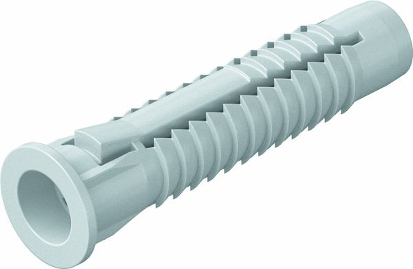 Auch als Hohlraumdübel geeignet, mit Kragen gegen Durchrutschen. 3 angesetzte Flossen nehmen das Drehmoment auf.