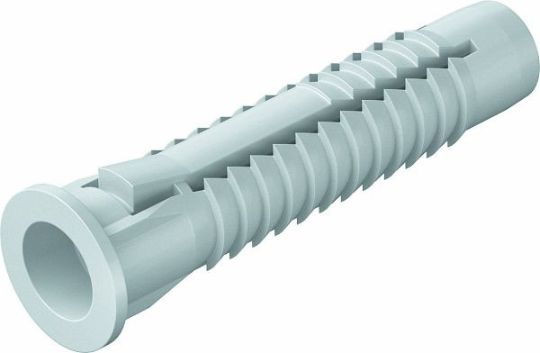Auch als Hohlraumdübel geeignet, mit Kragen gegen Durchrutschen. 3 angesetzte Flossen nehmen das Drehmoment auf.