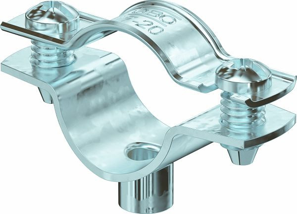 Abstandschelle zur Montage von Rohren und Kabeln an Wand, Decke und Boden. Mit selbstsicherndem Oberteil. Befestigung über Ansatz mit Innengewinde. Oberflächen G und FT ab Schellengröße 20 geeignet für Montage mit Nagelgerät oder Bolzensetzgerät.