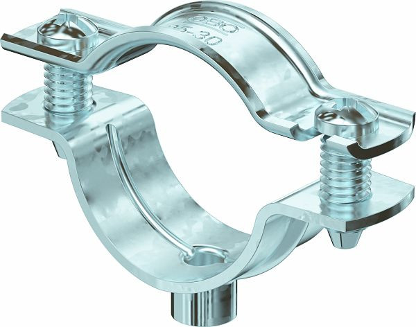 Abstandschelle zur Montage von Rohren und Kabeln an Wand, Decke und Boden. Mit selbstsicherndem Oberteil. Befestigung über Ansatz mit Innengewinde. Oberflächen G und FT ab Schellengröße 20 geeignet für Montage mit Nagelgerät oder Bolzensetzgerät.