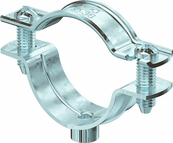 Abstandschelle zur Montage von Rohren und Kabeln an Wand, Decke und Boden. Mit selbstsicherndem Oberteil. Befestigung über Ansatz mit Innengewinde. Oberflächen G und FT ab Schellengröße 20 geeignet für Montage mit Nagelgerät oder Bolzensetzgerät.