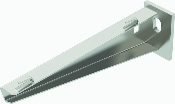 Leichter Wand- und Stielausleger mit angeschweißter Kopfplatte für die schraubenlose Gitterrinnenbefestigung.