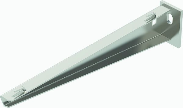 Leichter Wand- und Stielausleger mit angeschweißter Kopfplatte für die schraubenlose Gitterrinnenbefestigung.