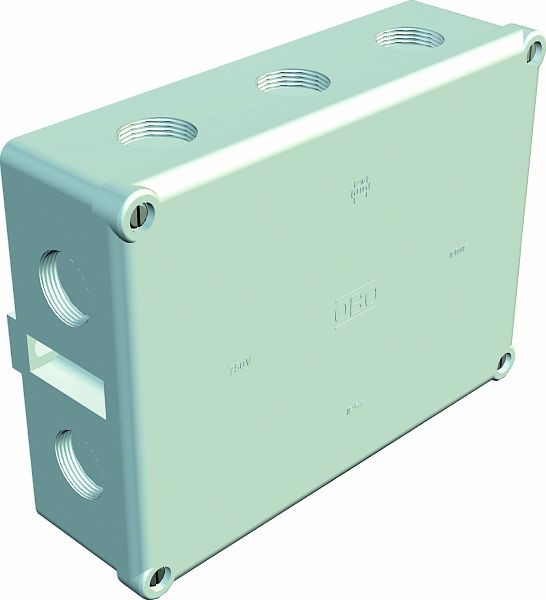 Schutzart IP54, Nennspannung 660 V, Nennquerschnitt 16 ÷ mm², 2 Befestigungslöcher für Schrauben bis 6 mm Ø an der Außenseite des Kastens. 4 Deckelschrauben, 10 ausbrechbare Einführungen mit Gewinde M25 x 1,5.