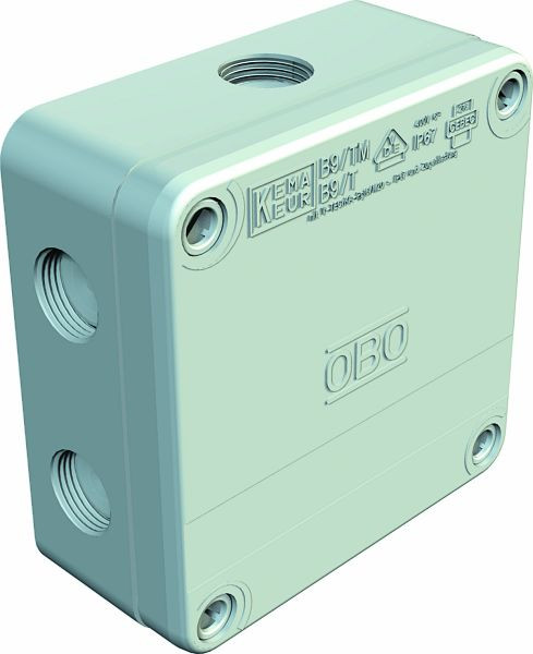 bei Verwendung der Kabelverschraubungen (zusätzliche Zugentlastung) ist ein Entfernen der Membran nicht erforderlich Der Kabelabzweigkasten B9/T... besteht aus zwei verschiedenen halogenfreien Kunststoffkomponenten. Er hat 8 Gewindeeinführungen mit Durchstoßmembranen (7 x M20 seitlich und 1 x PG16 im Boden) sowie eine Membraneinführung im Boden für Kabeldurchmesser bis 15 mm. Bei Verwendung der Kabelverschraubungen (zusätzliche Zugentlastung) ist ein Entfernen der Membran nicht erforderlich (Zeitgewinn). Schutzart IP 67 bei Durchstoßmembrane und bei Kabelverschraubung ohne Entfernen der Durchstoßmembrane. Nennspannung 400 V; Nennquerschnitt 4 ÷ 6 mm². Der Deckel wird mit 4 vormontierten, unverlierbaren Deckelschnellbefestigungen verschraubt (180°) und ist plombierbar. Die Befestigungslöcher sind zusätzlich mit einer weichen Kunststoffkomponente ausgespritzt, für Schraubendurchmesser 5 mm (Abstand 75 mm). Lichte Innenmaße 98x98x40