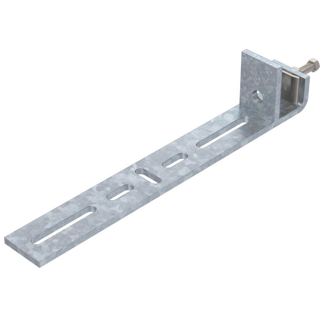 Befestigungsklemmstück zur Montage von leichten Bauteilen an senkrechten Stahlträgern. Geeignet z. B. für Gitterrinnen und Kabelrinnen bis 300 mm Breite oder Schellen. Der Verlauf des am Befestigungsklemmstück angebrachten Kabeltragsystems ist senkrecht.