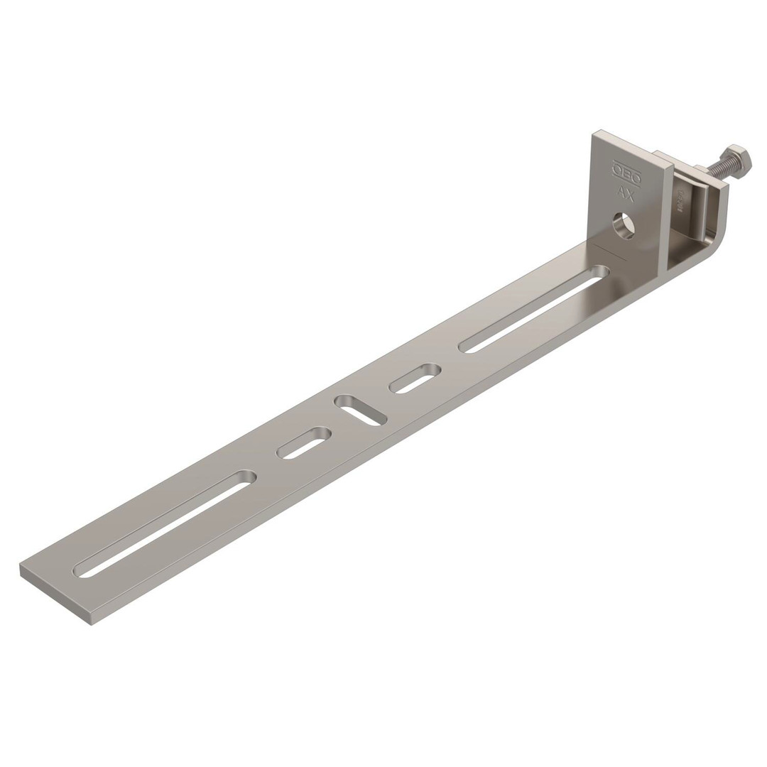 Befestigungsklemmstück zur Montage von leichten Bauteilen an senkrechten Stahlträgern. Geeignet z. B. für Gitterrinnen und Kabelrinnen bis 300 mm Breite oder Schellen. Der Verlauf des am Befestigungsklemmstück angebrachten Kabeltragsystems ist senkrecht.