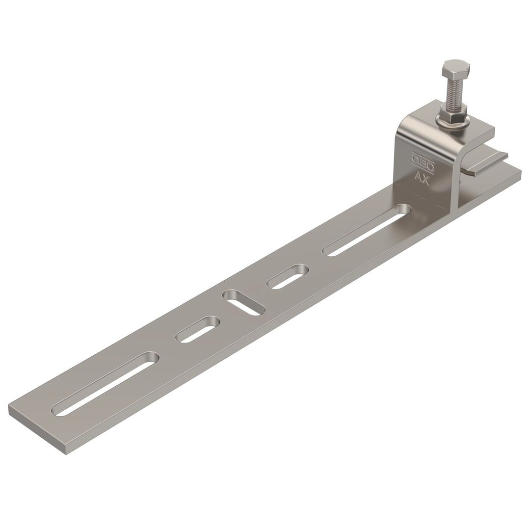 Befestigungsklemmstück zur Montage von leichten Bauteilen an waagerechten Stahlträgern. Geeignet z. B. für Gitterrinnen und Kabelrinnen bis 300 mm Breite oder Schellen. Der Verlauf des am Befestigungsklemmstück angebrachten Kabeltragsystems ist waagerecht.