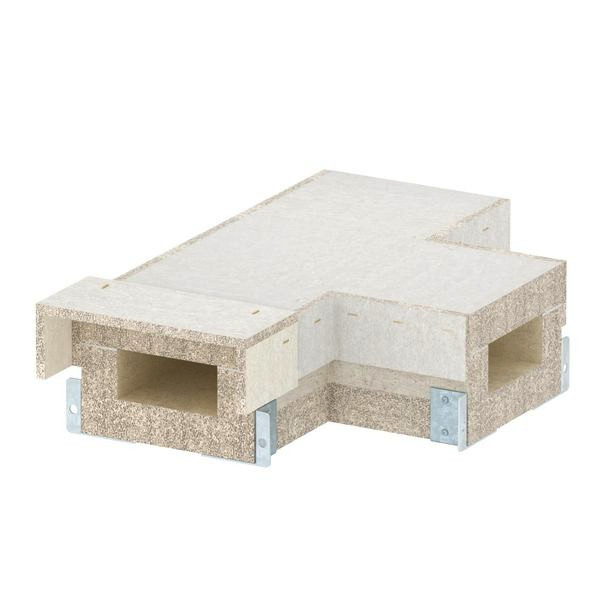 T-Stück für Brandschutzkanal PYROLINE® Con S, Typ BSKH09-K0511 bestehend aus wasser- und frostbeständigen Glasfaserleichtbeton zur Herstellung von T-Abzweigungen im Kanalverlauf. Fertig montierte Verbindungsbeschläge sorgen für eine schnelle Montage vor Ort, lose aufgelegte Deckel für eine schnelle Revision und Nachbelegung.