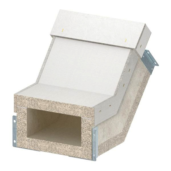 Vertikalbogen steigend für Brandschutzkanal PYROLINE® Con S, Typ BSKH09-K1021 bestehend aus wasser- und frostbeständigen Glasfaserleichtbeton zur Herstellung von vertikalen Richtungsänderungen (45°) im Kanalverlauf. Fertig montierte Verbindungsbeschläge sorgen für eine schnelle Montage vor Ort, lose aufgelegte Deckel für eine schnelle Revision und Nachbelegung.