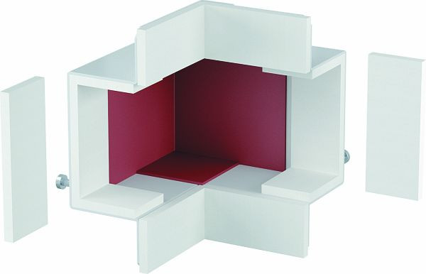 Formteil-Haube zur Abdeckung von zwei Kanalenden BSKM 0407 als Außeneck bei direkter Wand- und Deckenmontage. Inklusive eingeklebter Dichtungen zum Abdichten der Fugen und losen Dichtungen bei Kombination mit Gegenplatte.