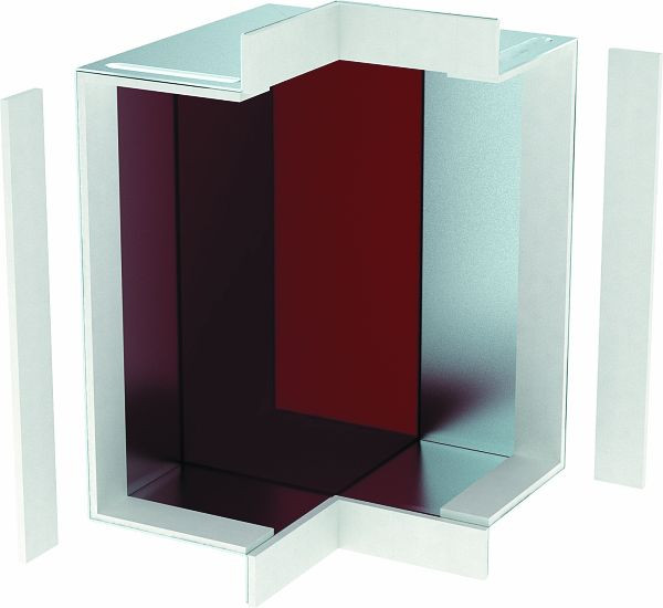 Formteil-Haube zur Abdeckung von zwei Kanalenden BSKM 1025 als Außeneck bei direkter Wand- und Deckenmontage. Inklusive eingeklebter Dichtungen zum Abdichten der Fugen und losen Dichtungen bei Kombination mit Gegenplatte.