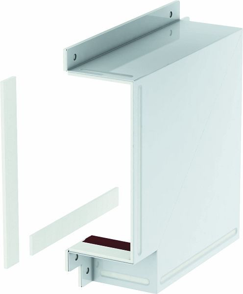 Formteil-Haube zur Abdeckung von zwei Kanalenden BSKM 1025 als Flachwinkel bei direkter Wand- und Deckenmontage. Inklusive eingeklebter Dichtungen zum Abdichten der Fugen und losen Dichtungen bei Kombination mit Gegenplatte, sowie Schrauben für den Potentialausgleich.