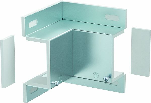 Formteil-Haube zur Abdeckung von zwei Kanalenden BSKM 0407 als Inneneck bei direkter Wand- und Deckenmontage. Inklusive eingeklebter Dichtungen zum Abdichten der Fugen und losen Dichtungen bei Kombination mit Gegenplatte, sowie Schrauben für den Potentialausgleich.