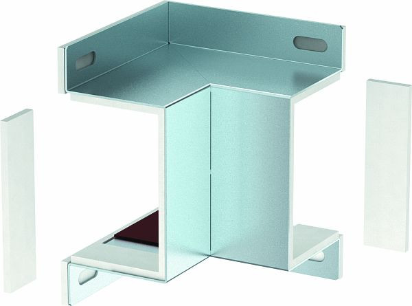 Formteil-Haube zur Abdeckung von zwei Kanalenden BSKM 0711 als Inneneck bei direkter Wand- und Deckenmontage. Inklusive eingeklebter Dichtungen zum Abdichten der Fugen und losen Dichtungen bei Kombination mit Gegenplatte, sowie Schrauben für den Potentialausgleich.