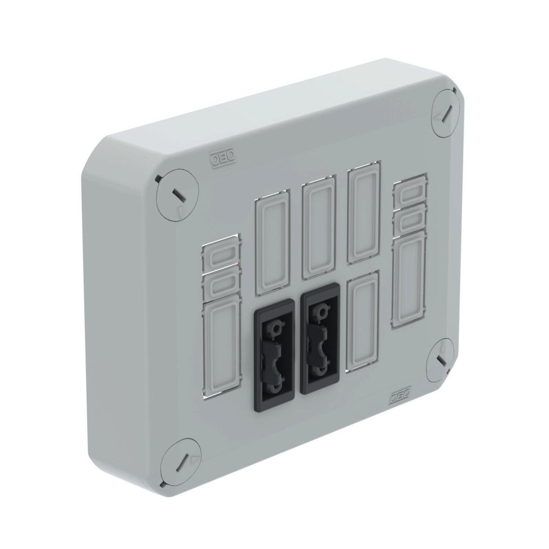 Steckbarer Deckel zum Verschließen von Kabelabzweigkästen, bestückt mit 2 Wieland GST18-Stecksystemen, vorverdrahtet mit Hebelsteckklemmen. Mit Schnellverschluss im Deckel, plombierbar. Halogenfreies Material, UV-resistent. Flammwidrig nach DIN EN 60695-2-11, Prüftemperatur 650°C. Schlagfestigkeit IK07 bei Raumtemperatur. Schutzart IP30.