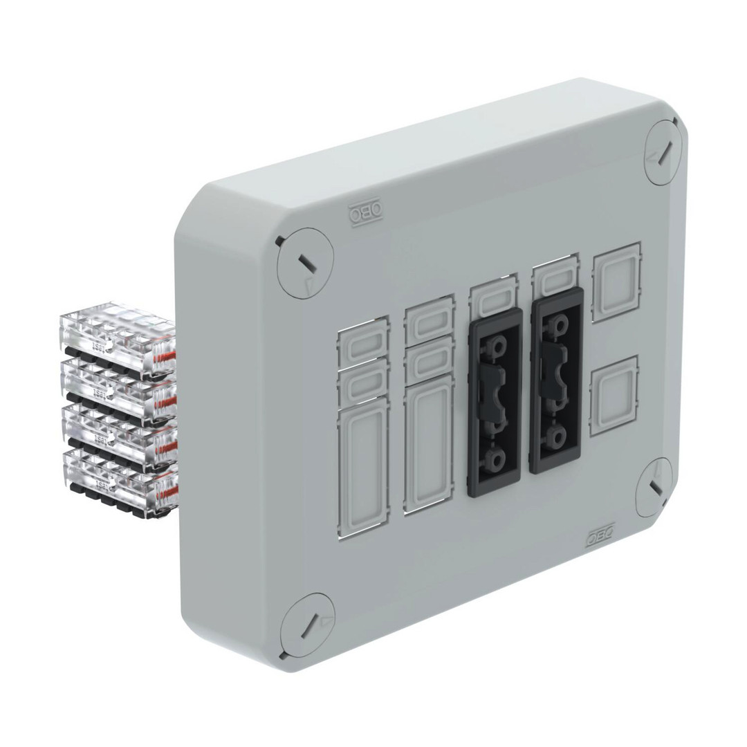 Steckbarer Deckel zum Verschließen von Kabelabzweigkästen, bestückt mit 2 Wieland GST18-Stecksystemen, vorverdrahtet mit Hebelsteckklemmen. Mit Schnellverschluss im Deckel, plombierbar. Halogenfreies Material, UV-resistent. Flammwidrig nach DIN EN 60695-2-11, Prüftemperatur 650°C. Schlagfestigkeit IK07 bei Raumtemperatur. Schutzart IP30.