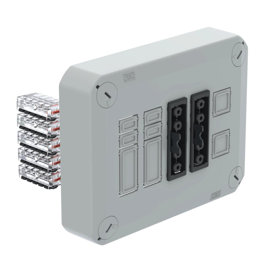 Steckbarer Deckel zum Verschließen von Kabelabzweigkästen, bestückt mit 2 Wieland GST18-Stecksystemen, vorverdrahtet mit Hebelsteckklemmen. Mit Schnellverschluss im Deckel, plombierbar. Halogenfreies Material, UV-resistent. Flammwidrig nach DIN EN 60695-2-11, Prüftemperatur 650°C. Schlagfestigkeit IK07 bei Raumtemperatur. Schutzart IP30.