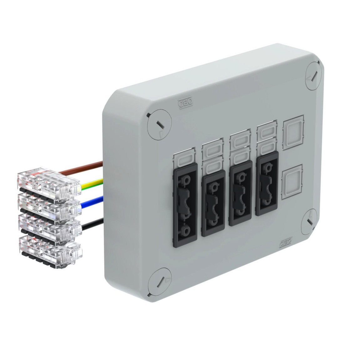 Steckbarer Deckel zum Verschließen von Kabelabzweigkästen, bestückt mit 4 Wieland GST18-Stecksystemen, vorverdrahtet mit Hebelsteckklemmen. Mit Schnellverschluss im Deckel, plombierbar. Halogenfreies Material, UV-resistent. Flammwidrig nach DIN EN 60695-2-11, Prüftemperatur 650°C. Schlagfestigkeit IK07 bei Raumtemperatur. Schutzart IP30.