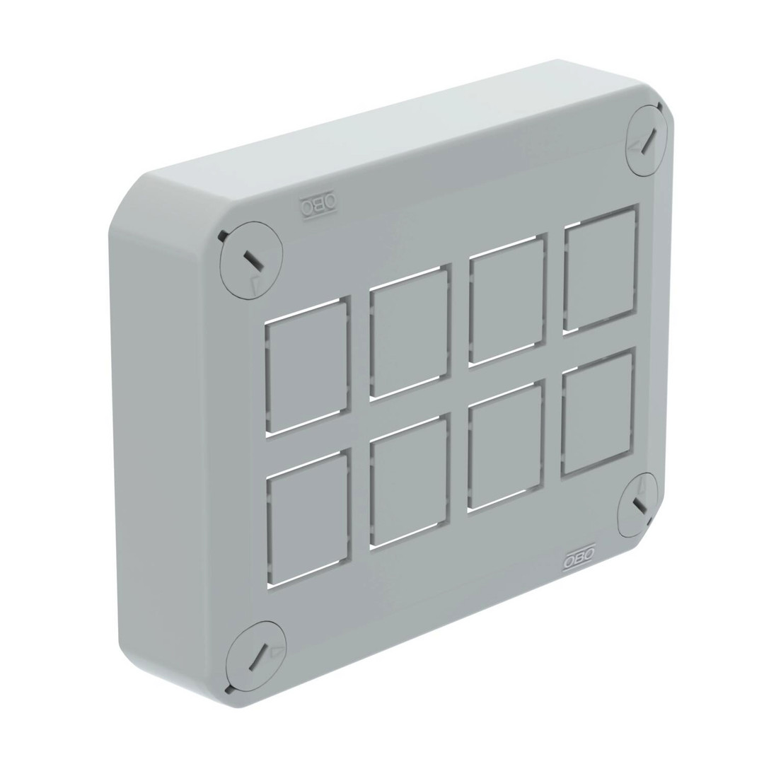 Steckbarer Deckel zum Verschließen von Kabelabzweigkästen, ausgestattet mit 8 Ausbrechöffnungen für DATA-Systeme auf Keystone-Basis. Mit Schnellverschluss im Deckel, plombierbar. Halogenfreies Material, UV-resistent. Flammwidrig nach DIN EN 60695-2-11, Prüftemperatur 650°C. Schlagfestigkeit IK07 bei Raumtemperatur. Schutzart IP30.