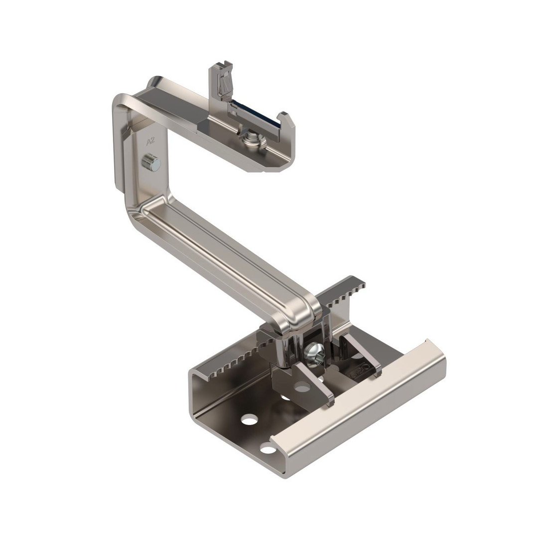 Dachhaken zum Montieren von Photovoltaik-Modulen auf Schrägdächern in Kombination mit Trägerprofil TP 45. Geeignet für Ziegeldächer. Rastbare Befestigung an Trägerprofil. Montage an Dachsparren mit Tellerkopfschrauben TKS. Dachhaken ist horizontal und vertikal über Verschraubungen stufenlos einstellbar, passender Schlüssel TX 40. Höheneinstellung im Bereich der Dachlatte von 40-54 mm, seitliche Verstellmöglichkeit bis zu 76 mm, Höhenverstellung des Trägerprofils bis zu 18 mm.