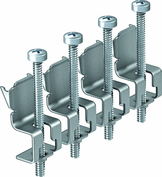 Vier Universalbefestigungen für runde Geräteeinsätze und Zugdoseneinsätze der Nenngrößen R4, R7 und R9 in Kanalsystemen, Doppel- und Hohlboden sowie für eckige Geräteeinsätze und Zugdoseneinsätze der Nenngrößen 4, 6 und 9 in Kanalsystemen. Zur Befestigung des Geräteeinsatzes GRAF9 werden acht Universalbefestigungen benötigt. Ersatzteil.