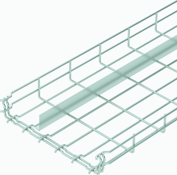 Gitterrinne mit angeformtem Verbinder und eingeschweißtem Trennsteg in der Seitenhöhe 55 mm.