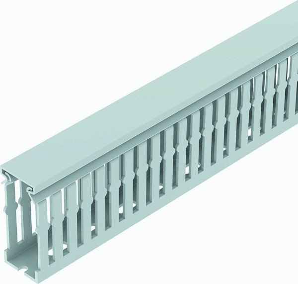 Halogenfreier Verdrahtungskanal inkl. Oberteil und Bodenlochung zur waagerechten und senkrechten Verlegung elektrischer Kabel und Leitungen im Schaltschrank. Mit doppelseitigen Klebeband am Kanalboden als Montagehilfe. Ausführung als metrischer Kanal. Das Ausbrechen der Stege erfolgt werkzeuglos. Sonderlängen auf Anfrage.