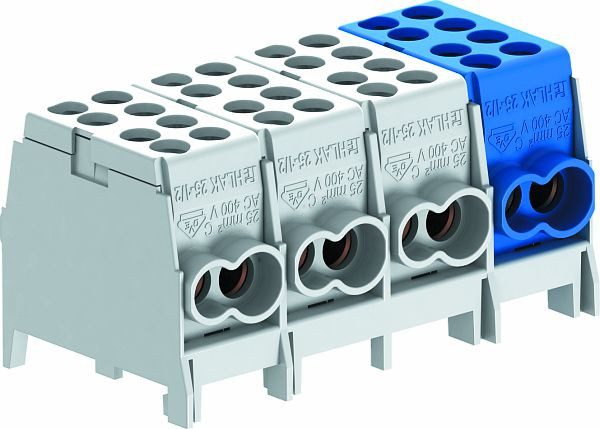 4-polige Hauptleitungsabzweigklemme mit 2 x 16 mm² + 2 x 25 mm² Leiteranschlussquerschnitten pro Pol. Mit 2 Schrauben pro Klemmstelle für einen sicheren Kontaktdruck. Hochfeste Schnellbefestigung aus verzinktem Stahlblech zur einfachen Montage auf Tragschienen.